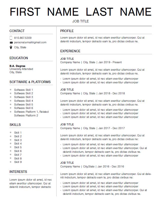 Remember that resumes are often printed in black and white only, so don’t rely on color. If you use it, that’s fine, but be sure to stick with black text (or something close to black for contrast) and only one additional color for design accent. If you use color, print it out in black and white to make sure it still looks good. Again, #1 priority is EASY TO READ.