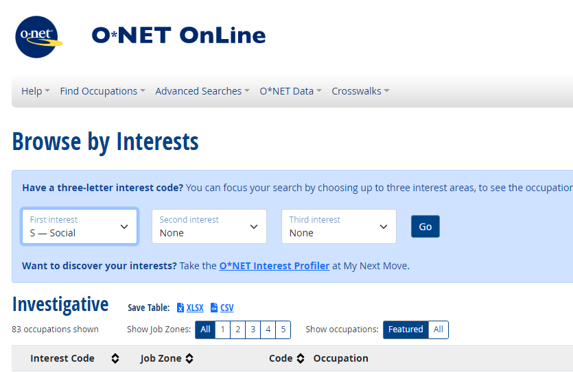 For example, I would click on “Social”, because my highest number was 26 in Social. If you want, you can go straight to this page: https://www.onetonline.org/find/descriptor/browse/Interests/ and then click on your highest-scoring word. That will take you to the page that shows your highest letter in the first position and then you can enter the next two letters in the boxes that say “None selected.”