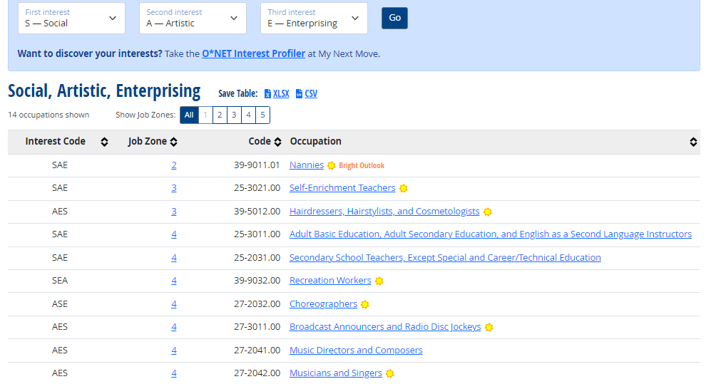If the list you see at first doesnt excite you, try different things. Enter different job zones. If there aren’t enough choices for you or you don’t like these choices, try entering just TWO LETTERS OF YOUR CODE! Play around with one Job Zone or all 5.